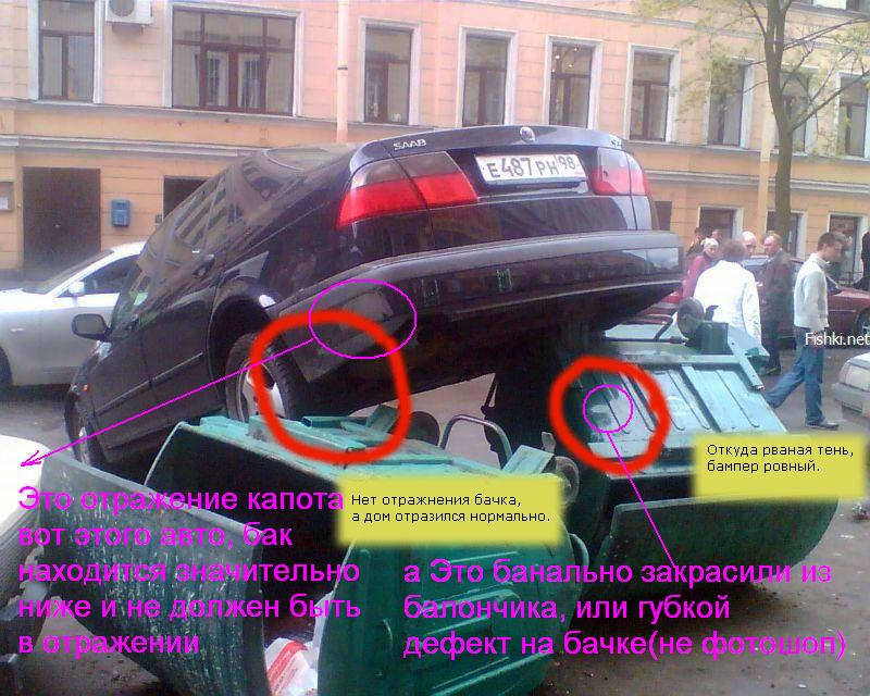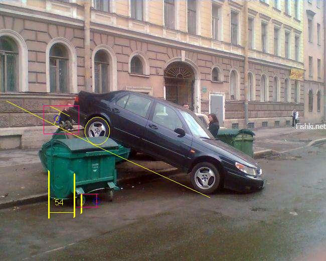 Итак поехали, с той фоткой где каменты написаны - повторяться не будем, кстати бачёк ну ни разу не пластиковый, он из 5ти миллиметрового аллюминиевого сплава сделан, - типа чтоб не гнил... а по самой первой фотке - видите выступ над колесом бачка - так вот этот выступ попал ПОД бампер, колёса(бака) которые были ближе к бордюру, в бордюр упёрлись, а так как машина не пушинка, и около полутора тонн весит, по инерции катилась назад, мнгновенно остановиться не могла, услышав удар - водитель испугался, и как это бывает нажал на газ, причём тут писали как так можно... реально можно, а почему СИЛЬНО, да потому что вы как водители знаете, что в таких ситуациях на ТОРМОЗ медленно и плавно не нажимают... вот водила и ударил по педали, со всей дури... Авто похоже на СААБ 9.5, а они часто турбированые, так что там около 200-от лошадок, и вот всем этим табуном, машинка понеслась на зад... А сзади бак. начинаем его опрокидывать, бампер то выше чем колёса упирающиеся в бордюр, и тут этот вышеупомянутый выступ, играет роковую роль, он упирается в бампер снизу.... и приподнимает зад автА... Но и это ещё не всё, происходит всё быстро, и задний бампер уже приподнят... бак уже лежит (пусть будут эти самые 50-60 см.) НО, задняя часть и задний бампер - УЖЕ на этом самом баке... а на газ то давят, машина то переднеприводная... вот и наползает она на баки, там и второй упал, и на него наехали... ... всё. или водила успокоился, или авто забуксовало... критику и обсуждения принимаю.
