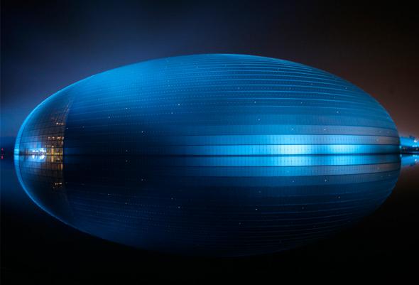 Национальный Большой театр в центре Пекина 17 сентября 2009 года. Здание театра подсвечивается цветными огнями в преддверии празднования 60-летия образования КНР.