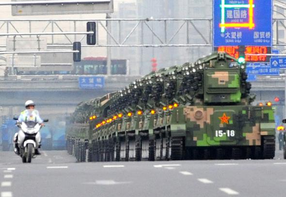 Танки Китайской народно-освободительной армии готовятся выехать на главную восточно-западную дорогу, Проспект Небесного спокойствия в Пекине 18 сентября 2009 года во время репетиции к параду 1 октября, который ознаменует 60-летие образования КНР. Улицу заполонили службы безопасности, прогоняя гражданских с маршрута, по которому пройдет парад через самое сердце города мимо площади Тяньаньмэнь.