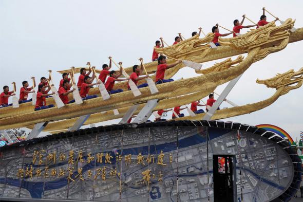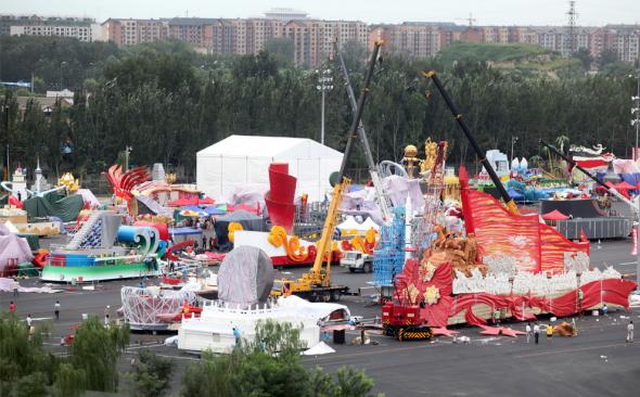 Рабочие собирают декорации в виде лодок для парада недалеко от центра Пекина 27 августа 2009 года. Китай начал усиливать меры безопасности, чтобы предотвратить любые беспорядки в честь дня, когда 60 лет назад Мао Цзэдун объявил об основании КНР.