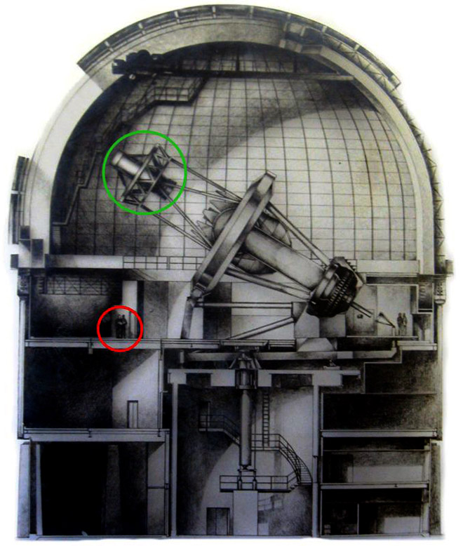 Телескоп Виктора Бланко расположен в одной из самых передовых обсерваторий южного полушария — Интерамериканской обсерватории Сьерро-Тололо в Чили. На схеме телескопа для масштаба изображены два человека (красный круг) и место установки Dark Energy Camera (зелёный круг).