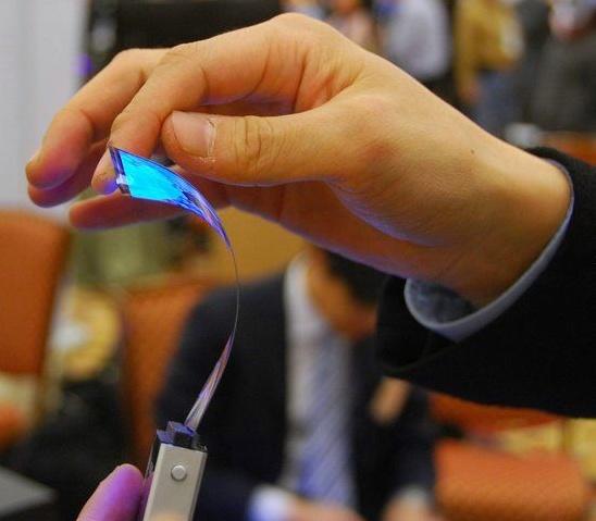 В частности производитель предъявил публике работающий медиаплеер с таким дисплеем – ярким и четким, диагональю 4,5 дюйма, с разрешением 840 х 840. Подобный дисплей изготавливается на основе пластикового (а не стеклянного) субстрата, в который вплавляется металлическая пластина. Готовое изделие 0,3 мм толщиной можно свернуть в «сигару» радиусом всего 1 см! Компания объявила, что усердно работает над приближением момента, когда новинку можно будет запустить в массовое производство – в первую очередь ее планируется применять в производстве смартфонов и планшетов.