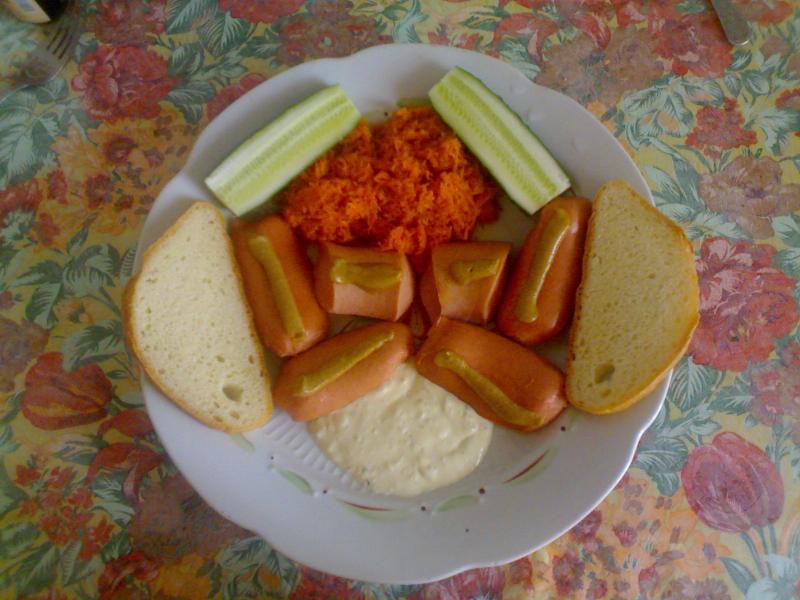 Ну на фотке все видно)) Можно добавить - белая хрень это соус тартар, красная - морковка по корейски (сам делал), сама колбасня отварена в в воде с добавлением шашлычного кетчупа, перца, соли и лаврового листа. Жру.
