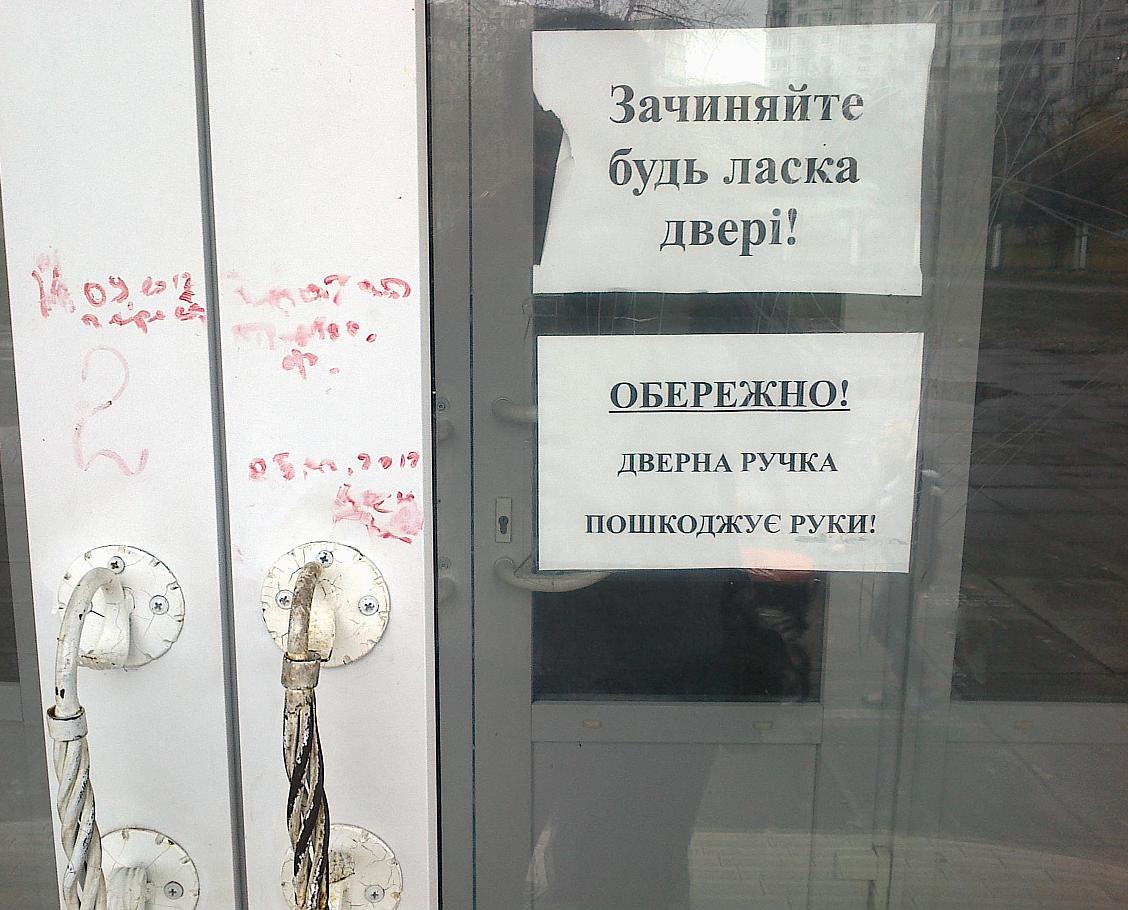 Слева видимо кровь тех, кто не прочел второй текст... Там с внутренней стороны палец застрять может очень легко, между прутьев разошедшихся. Заменить ручки видимо никак - достопримечательность данного заведения. Это парадный вход Оболонского ЗАГСа! Готовит, так сказать, к тяготам дальнейшей жизни))