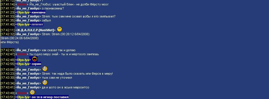 ![]() [19:45:25] <!Irinka__{corbina}> Ж.Д.А.Л.К.Е.Р.[NashNet]: ![]() [19:45:37] *** Пришел: k0lyayy2002_{corbina} [19:45:39] <Ж.Д.А.Л.К.Е.Р.[NashNet]> ![]() [19:45:46] <!Irinka__{corbina}> ![]() [19:45:52] *** Пришел: UnclePiT [19:45:55] *** Ушел: Balamut [19:45:56] <!Irinka__{corbina}> а тепер ще Олечку поцілуй [19:46:02] <Olya-lya> епт [19:46:05] <Olya-lya> сняла джинсы