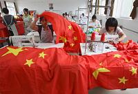 Рабочие шьют национальные флаги на заводе на окраине Пекина 4 сентября 2009 года. Спрос на флаги особенно возрос в преддверии национального праздника.