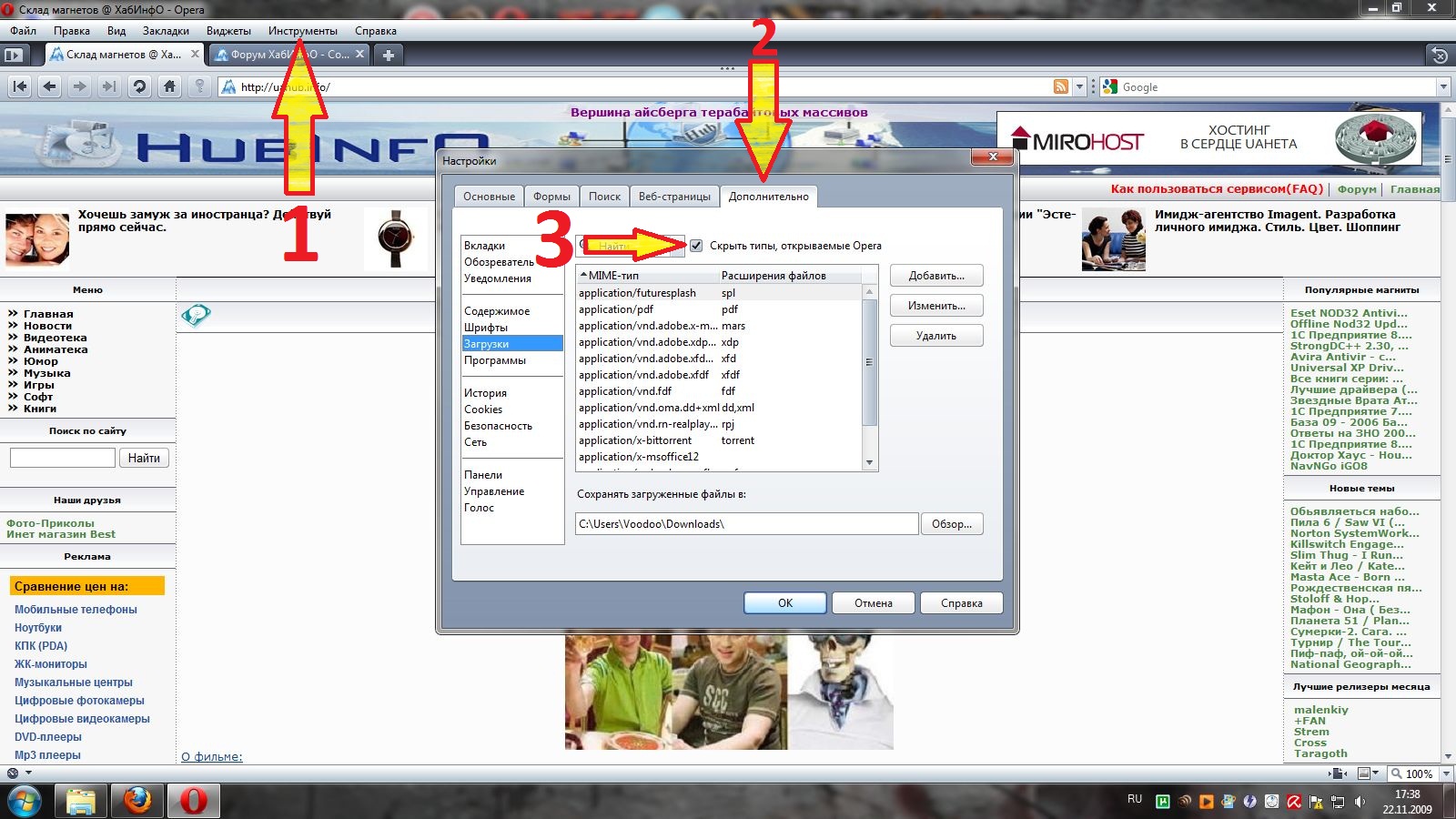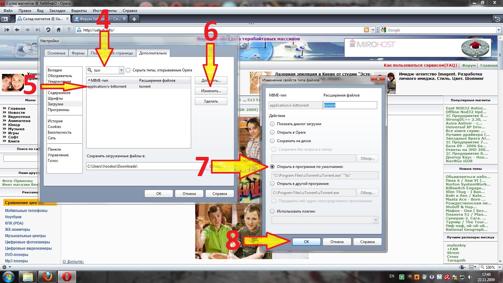 2 Нажимаем Дополнительно 3 Убираем галочку 4 Вводим torrent 5 Выделяем appication/x-bittorent 6 Нажимаем Изменить 7 Ставим галочку на Открыть в программе по умолчанию: ("C:\Program Files\uTorrent\utorrent.exe" %s") 8 Нажимаем ОК см. на картинках: