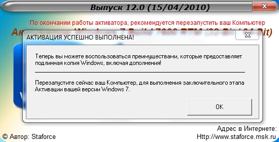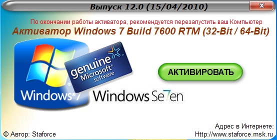 Если вы не "перешивали" БИОС, а воспользовались иными методами активации Вин-7, а то и вообще еще не добрались до этого — предлагаю Вам предельно простой и действенный метод. Если у Вас уже активированный виндовс, внезапно "почернел" то Ваш самый первый шаг состоит в том, что бы удалить свежие обновления, установленные в системе. Честно сказать — не стал разбираться, откуда торчат уши и просто прибиваю 3 последних, установившихся за неделю. Кому нужно знать "какое именно обновление нарушило работу активатора"... предлагаю прогуляться по форумам. Шаг первый. Скачайте файл активатора по этой ссылке: https://narod.ru/disk/21046516000/76...2010).zip.html и сохраните его прямо на рабочий стол. Взять его Вы можете и у автора по адресу: https://www.starforce.msk.ru но там потребуется регистрироваться на сайте, впрочем это Ваше личное дело. Шаг второй. Подразумевается, что "свеженькие" обновления Вы уже удалили. Внимание! Крайне желательно все последующие действия выполнять при отключенном соединении с интернет. Нажимаем ПУСК > ставим курсор в панельку НАЙТИ ПРОГРАММЫ И ФАЙЛЫ и вводим латиницей: cmd получаем примерно следующее: Внимание! Если у Вас по каким либо причинам система выдает несколько ссылок на эту программу — подведите поочередно к каждой из них курсор мыши и во всплывающем окошке убедитесь, что одна из них находится по адресу ....\windows\system32\ в остальных случаях это может быть либо ссылка, либо (неисключено!) результат шалостей вирусов в системе. Итак, определившись с командным интерпретатором, подведите к нему курсор мыши и нажмите правую кнопку. В выпавшем меню выберите "ЗАПУСК ОТ ИМЕНИ АДМИНИСТРАТОРА" и нажмите на строку ЛЕВОЙ кнопкой мыши. Откроется окно, подобное этому: прямо в окне введите с клавиатуры следующую команду: slmgr /rilc маленькими латинскими буквами и нажмите кнопку Ввод (она же Enter). Спустя несколько секунд (в зависимости от мощности Вашего компьютера) откроется окно примерно следующего вида: На картинке я его сознательно обрезал, у Вас же оно займет весь вертикальный размер экрана. Закройте это окно, просто нажав "крестик" в правом верхнем углу. Возвращаемся в наше "черное окошко"и набираем там следующую команду: slmgr /rearm Нажимаем Энтер и ждем еще несколько секунд до появления: Собственно на этом первый этап закончен и Вам нужно выполнить перезагрузку. Нажмите на ОК и перезагрузите систему принудительно. Шаг третий. После запуска системы ОСТАНОВИТЕ ВАШУ АНТИВИРУСНУЮ СИСТЕМУ, поскольку некоторые системы блокируют работу активатора, затем найдите на рабочем столе скачанный Вами файл активатора: Нажмите на него правой кнопкой мыши и запустите от имени Администратора. В открывшемся окошке вариантов у нас немного, — нажимаем АКТИВИРОВАТЬ и если Вы, как и я, еще не избавились от вредных привычек — можете выйти на перекур, этот процесс затянется на время от 2-х минут и дольше... По окончании наблюдаем картинку № "последнюю": Ну раз просят перезагрузиться — перезагрузимся и после этого соединимся с Интернет... Внимание, важно! До тех пор, пока Вы не соединитесь из этой системы с интернет в данных о состоянии системы будет информация: "НЕТ ДАННЫХ". После соединения в течении нескольких секунд информация изменится на примерно то, что Вы можете видеть на следующем изображении. Для нас в данном случае важна информация в нижней части окна. Если не в курсе, то посмотреть да