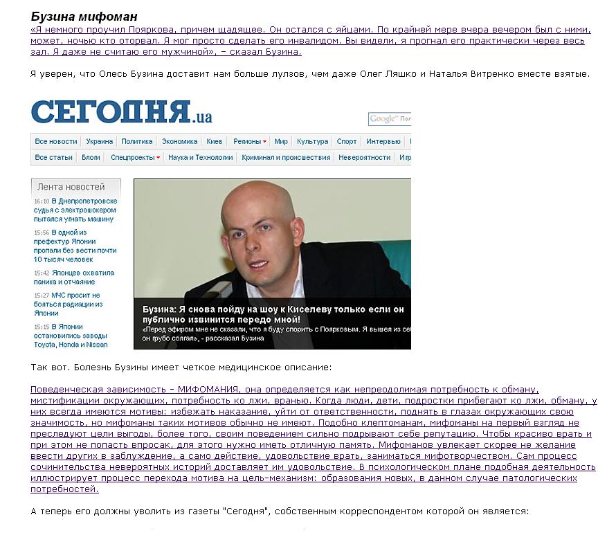 "Киселев не хочет разговора, он хочет драки. Так пусть ведет бокс. Я жду от него извинений. Соглашусь участвовать снова в его шоу только после того, как он публично извинится за подставу, которую они с Поярковым устроили", - заявил О.Бузина, которого цитирует "Сегодня".
