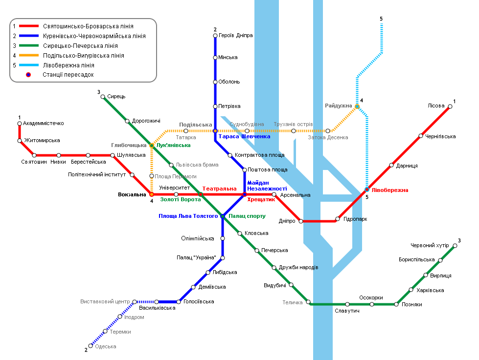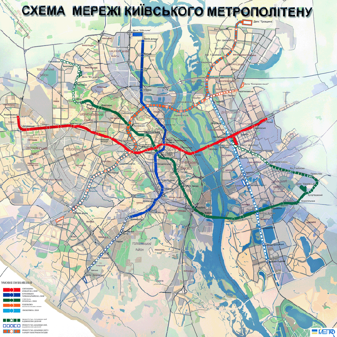 Проект участка Подольско-Выгуровской линии метро от станции "Глыбочицкая" до станции "Радужная" с эстакадным вариантом прохождения трассы по Подолу с ответвлением в сторону жилого массива Выгуровщина-Троещина прошел комплексную государственную экспертизу и утвержден распоряжением Киевской городской государственной администрации (КГГА) от 20 мая 2008 года. В КП "Киевский метрополитен" не ответили на вопрос о том, есть ли уже определенность, пройдет ли Подольско-Выгуровская линия метро по ул. Бальзака или по ул. Маяковского. "Вопрос решается Киевской городской государственной администрацией", - сообщили в пресс-службе столичной подземки. В то же время начальник КП "Киевский метрополитен" Петр Мирошников отметил, что перенесение строительства трассы метро на Троещине с улицы Бальзака на проспект Маяковского является нецелесообразным. По его словам, уже разработан соответствующий проект строительства наземной линии метро по улице Бальзака, по которому плановый срок строительства трассы составляет 5 лет. Кроме того, строительство подземной трассы метро по проспекту Маяковского обойдется в 3-4 раза дороже. Согласно утвержденным проектным решениям, срок строительства Подольско-Выгуровской и Левобережной линий метро составляет 62 месяца. "На данное время не определено, когда будет начато строительство, ведутся работы по подготовке территории для начала строительства", - говорится в сообщении. Сметная стоимость участка Подольско-Выгуровской линии составляет 5,506 млрд грн, Левобережной линии – 3,365 млрд грн. Проект Левобережной линии метрополитена Троещина-Осокорки от улицы Милославской до станции метрополитена "Левобережная с электродепо "Троещина" в Деснянском и Днепровском районах столицы прошел комплексную государственную экспертизу и утвержден распоряжением КГГА от 23 июня 2008 года. Куренівсько-Червоноармійська лінія Стратегічним приорітетом розвитку лінії є введення в дію станцій на півдні столиці для забезпечення транспортом жителів Теремків та Голосієво. Дільниця ст. “Либідська” - ст. “Виставковий центр” (протяжність 4,99 км, 4 станції). 15 грудня 2010 року введено в експлуатацію три станції першої черги "Деміївська", "Голосіївська" та "Васильківська". На даний час споруджується дільниця від ст. "Васильківська" до ст. "Виставковий центр". Дільниця від ст. “Виставковий центр” - до Одеської площі (2 станції - "Іподром", "Теремки"). Майстерні з ремонту ескалаторів. Сирецько-Печерська лінія Вихід на ст. “Львівська брама”. Дільниця лінії від ст. „Сирець” до ст.”Виноградар”. Другий пересадочний вузол між станціями “Театральна” та “Золоті ворота”. Подільсько-Вигурівська лінія Спорудження лінії має стратегічне значення у розвитку транспортної структури столиці. Лінія доповнює існуючу радіальну схему метрополітену, перетинаючи діючи лінії і розширюючи таким чином систему пересадочних вузлів. В зоні її впливу розташовані великі житлові масиви Лівого берегу: Лісовий, Воскресенка, Райдужний, майбутня житлова забудова Русанівських садів. До лінії тяжіє також найбільший в Києві житловий масив Троєщина, до якого поїзди прямуватимуть по відгалуженню на Лівобережноу лінію. І черга цієї лінії спільно з І чергою Лівобережної лінії забезпечить транспортне обслуговування близько 450 тис. мешканців цього житлового масиву. Дільниця ст. 