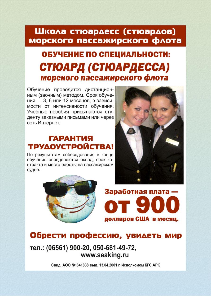 - обучение для парней и девушек от 17 до 32 лет по специальности "стюард морского пассажирского флота" - подробнее на сайте seaking.r u - обучаться можно через интернет, дистанционно - различные варианты, всё для удобства обучения - в технические средства обучения входит выдача курсанту ноутбука на период обучения (по желанию) - основное время обучения в морской школе отводится изучению английского языка - выпускники морской школы имеют возможность получить работу на круизном флоте, собеседование с работодателями проходит в офисе морской школы - на сайте морской школы есть список выпускников, получивших работу в круизных компаниях - всем желающим высылается бесплатно буклет о нашей морской школе и рассказами выпускников о работе на круизном флоте. Для получения буклета просим сообщить адрес, куда Вам данный буклет прислать (можно указывать реальный почтовый адрес, электронный адрес, адрес "до востребования" в почтовом отделении) - узнать о специфике работы на круизном лайнере Вы можете у наших выпускников, кто уже был в море на контракте в круизе: +38 050 6948112 - Михаил, +38 050 9828525 - Элла. - выпускникам не надо будет искать себе работу, администрация морской школы берёт этот вопрос на себя тел. морской школы в Керчи: (06561)-90020, (06561)-90030, моб. (050)-6814972, (067)-89511324, сайт seaking.r u, magistr()seaking.r u |