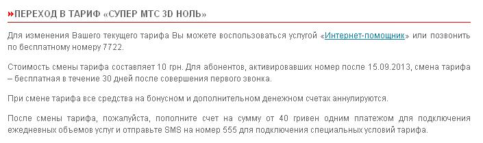 Как то 35грн опечалило, а потом еще и на 40 пополнять надо - вобщем они идийоты, потому как переход на Супер МТС 3D Ноль стоит всего 10грн - то есть переходим туды, а только потом сюды)
