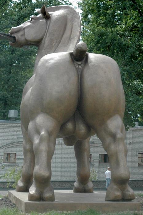 В Воронеже поставили памятник вот такой зверушке. Местный Церетели видимо впечатлился творениями московского собрата и не пожалел чугуна на животину. Чтобы животное не худело, ему нужно много железа в организме, поэтому конь жует кусок металла, отдаленно похожий на рельс (Спонсор статуи - Российские Железные Дороги) Но это все мелочи, по сравнению с тем, с каким любовью и тщанием, скульптор вылепил конский девайс для воспроизводства. Все кобылы Воронежской области должны укладываться щтабелями при виде этого чуда! Но к сожалению, т.к. большая часть чугуна ушла на гиганскую ЖОПУ и прочие жизненно важные органы, то кое-чем пришлось пожертвовать... Вместо шикарного конского хвоста получилась некая затычка вставленная животному в задницу для, только одному скульптору понятных, целей. Короче, ВоронеЖЖОТ!!! |