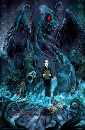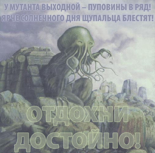 В.В. Путин про Ктулху Я вот не понимаю, в чём прикол этого вашего Ктулху. Почему все его так любят, и "фтагн" превратили чуть ли не во второй "превед". Лавкрафт писатель средненький с любой точки зрения. Если судить по меркам жанровой литературы - пишет в устаревшей манере и не страшно, на спинной мозг не действует. Если по меркам большой литературы - сюжетные схемы однообразные, образы бедные. Всю жизнь описывал один-единственный мирок, очень ограниченный, предсказуемый, я бы даже сказал, уютный. Хвалят его за изображение "нечеловеческих космических сил". Да полноте-с! Все его боги и чудовища примитивны донельзя, с рефлекторным поведением на уровне беспозвоночных - "заползти в нору", "схватить", "сожрать", "отложить яйца". Сравните хотя бы с Лемом - океан Соляриса, туча Региса, двутелы Эдема - насколько богаче фантазия, и насколько эти создания действительно вне всяких привычных человеческих представлений. Только одно у Лавкрафта хорошо - прелестный стиль, но в русских переводах, как правило, безграмотных, оценить его невозможно. В общем, не понимаю популярности этого автора совершенно. хз кто. «Оккультист к отцу пришел И спросил привычно: - Ктулху - пнглуи? Хорошо? - Фхтагн, сынок! Отлично! У меня секретов нет, Слушайте, детишки, Что безумный Аль-Хазред Помещает в книжке!.. Кто ученый, знает тот, Что во тьме бормочет Жуткий ужас Азатот - Кушать очень хочет. Йог-Сотот - и ключ и дверь, Формой непонятен. Если вызвать зря - поверь: Очень неприятен! Мертвый Ктулху спит на дне, В Р’лайхе под волнами. Знай, сынок, он и во сне Вечно будет с нами! Тсаттхогуа-кровожад Щелкает клешнями. Жертву ждет, с Юггота гад, Исходя слюнями. Йа! Шаб-Ниггурат! Гляди, Вон Тысячелетний С Легионом Молодых!… Впрочем, это бредни. Правду знаешь ты теперь, Отрицать нелепо. Право слово, уж поверь Мне, Ньярлатотепу…» Ньярлатотеп про Ктулху В интернете: выражение «Ктулху фхтагн» может в зависимости от ситуации обозначать: «Тут Ктулху спит! Прекратите буянить! Или вы хотите, чтобы он вас зохавал?» «Ктулху крут, хоть и спит!» «Пусть тебе снится то же самое, что и Ктулху. Приятных сновидений, хе-хе». «Я тут, типа, культист. Принимайте меня за своего». «Слабо перевести?» «А вы знаете, кто такой Ктулху?» «Я круче вас, я знаю, кто такой Ктулху!» «Я хочу красиво с вами попрощаться, ребята». «А Ктулху мой моск ужы зохавал, гы!» — приписывается т. н. «падонкам». «Я должен донести до мира печальные новости о Ктулху» — приписывается сумашедшим спиритам. «Вступайте в мою секту!» — приписывается Гробовому. «Глядишь, модеры и не увидят ссылку на порносайт в этом предложении» — приписывается спамерам. «Всем спать!!!» — используется воспитательницами в детских дошкольных зохавах. Постепенно появляется всё больше людей, готовых отправиться на поиски Ктулху, дабы пробудить его. Особенно много среди них студентов, а особенно они активны во время сессий.