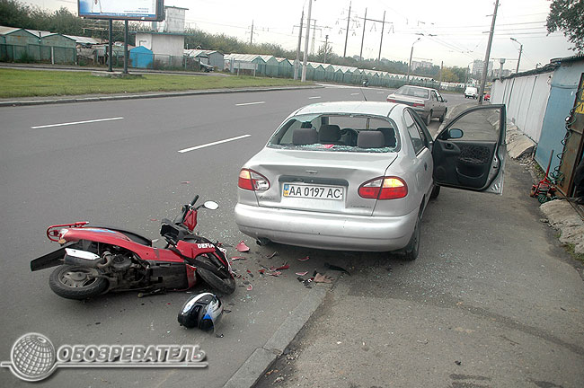 Вторая авария произошла с другой стороны дороги. На обочине стоял припаркованный «Ланос», и сзади в него влетел парень на «табуретке». По свидетельству очевидцев, скорость мотороллера была приличной - не менее 50 км/час. Водитель «Ланоса» отделался легким испугом, а вот наездник мотороллера - Александр - заработал сотрясение мозга. «У меня заклинило руль!» - так прокомментировал произошедшее, лежа на кушетке в «скорой», виновник аварии. Кстати, он, несмотря на головную боль, от госпитализации отказался.