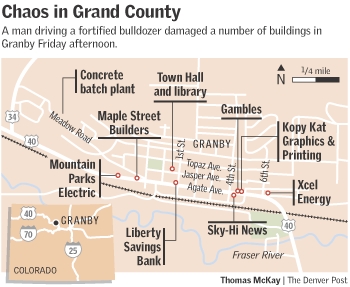Химейер активно отстреливался через прорезанные в броне амбразуры. Ни один человек от его огня не пострадал. Потому что стрелял он существенно выше голов. Проще говоря, в небо. Однако полицейские приближаться к нему больше не решались. В общей сложности считая егерей их к тому времени собралось около 40 человек. Бульдозер принял больше 200 попаданий из всего - от служебных револьверов до М-16 и гранат. Его попытались остановить здоровенным скрепером. "Komatsu D355A" без особого труда запихал скрепер задом в фасад магазина и там оставил. Машина набитая взрывчаткой на пути Химейера тоже не дала нужного результата. Единственным достижением стал пробитый рикошетом радиатор - впрочем, как показывает опыт карьерных работ, такие бульдозеры далеко не сразу обращают внимание даже на полный отказ системы охлаждения.