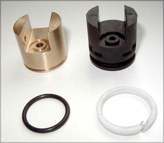 В отличие от "родного", где в качестве уплотнения использовано разрезное кольцо из пластика, похожего на фторопласт. Кстати, если не менять родной останавливатель, то его стоит, во-первых, укоротить на 1-1,5 мм, во-вторых, - заменить уплотняющее кольцо на резиновое, тем более, что есть стандартные подходящего размера. Пулеприемник скоро тоже поставлю новый из латуни. Шарик внутри паза останавливателя подпружинен, сделан для удержания пулеприемника. Но он не нужен. Нужно более четко выбрать зазоры в нижнем винте, который фиксирует сам останавливатель, и тогда эффект выпадения пулеприемника при взведенной пружине исчезает. Останавливатель не отходит назад, когда освобождается от давления пружины.