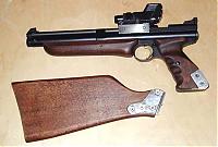 Пистолет с новым деревянным прикладом, рукояткой и цевьем. Все выполнено из бука. Крепление для коллиматорного прицела для установки прямо на ствол. Источник: airgun.narod.ru