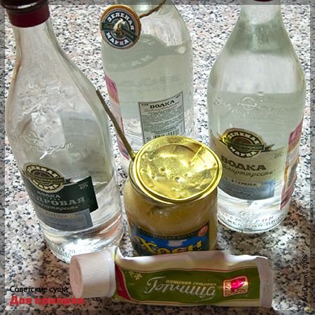 Для первого мы взяли простую русскую водку и обыкновенный тертый хрен (не васаби!). Затем мы их просто смешали в пропорции 1/1, добавив немного поваренной соли. Если вы придерживаетесь бессолевой диеты, то соли можно не добавлять. Это основной соус для советских суши. Макая в него суши, вы одновременно и выпиваете, и закусываете.