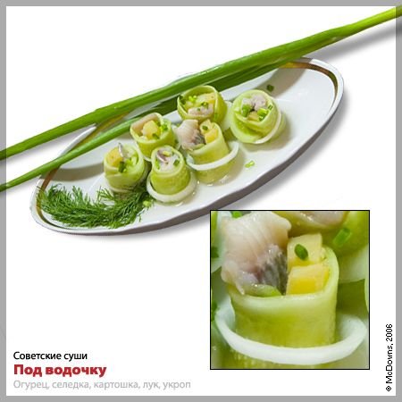 Следующий рецепт — очень похожий, казалось бы, но в то же самое время совершенно иной по вкусовым ощущениям. При правильно подобранных ингредиентах можно добиться удивительного эффекта. Называется он просто: «Под водочку». Итак, возьмите вареный картофель (кстати, во всех рецептах мы рекомендуем использовать картофель в мундире) и тщательно очищенную селедку, оберните в освобожденный от кожицы свежий огурец и также закрепите колечком репчатого лука. Украсьте зеленью укропа и перьевым луком.