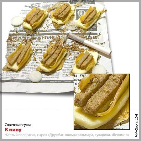 На половинку расплющенной тушки желтого полосатика уложите кусочек плавленного сыра «Дружба» (мы настаиваем именно на этом сорте!), на сыр — два сухарика по вкусу, а по бокам от сухариков поместите два ломтика от вяленого кольцами кальмара. Все это необходимо (!) посыпать табаком из папирос «Беломор». Данные суши можно макать в девятую «Балтику» и запивать надлежит ей же. Поэтому для натур эстетствующих данный рецепт не подходит.