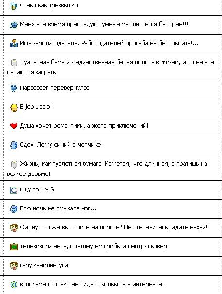 напилася я пьяаааана а я лягу приляяягу головою на фляяягу выпью кружечку брааааги хорошо так в мозгу берегите голову как будто там что то есть секс в ваной опасен для здоровья сердце сваренно. в молоке, лист крапивы, в глазах костёр. Лунный свет на твоей руке, на рубашке красный узор; на рубашке красный петух, да и мне ли жалеть огня, как захватит от дыма дух, как светло улыбнётся Князь...)) вкусный поцелуй это когда у парня губы намазаны сливками а девушка ток после минета Душа не жопа. Высраться не может. Интуиция - это способность головы чуять попой. Самое главное при работе с компьютером - не давать ему понять, что ты торопишься... Кто к нам с пивом придет, тот за водкой и побежит. Насравшим в душу бумагой жопу не подотрёшь!!! Если у вас возникли проблемы с женой - надо кончать с подругами. Если ты нагнулся и увидел у себя четыре яйца, то не возрадуйся, что у тебя два хуя, а посмотри, не ебёт ли кто тебя! ИсЧеЗ с РаДаРоВ. Сердце, опущеное в БОРЩ!!! раздвоение личности одна я хочет в постель другое я имеет жизнь с заду ===>. -Ты кто? -Я? Я добрая фея! - О как! А чего с топором? -Бля... да настроение плохое... РАЗБУДИТЕ ОКОЛО 6 !!. Не будите во мне зверя .... Он и так не высыпается! пойду утоплюсь.... Тело, не погруженное в воду - пахнет. Тело, частично погруженное в воду - плавает. Тело, полностью погруженное в воду, через 5 минут перестает сопротивляться. Если тело, погруженное в жидкость не всплывает, значит, оно утонуло. Жидкость, погруженная в тело, выводит оное из равновесия. ПРЕДУПРЕЖДЕНИЕ. зла как тысяча чертей, если вы хотите покончить с жизнью, то добро пожаловать, P.S. сноска - для зайкина нежный поцелуй * у мню летать охота в глубоком и темном болоте мечтая о высшем мыслями улетаем в рай но дорога назат дорога вылажена острой шебенкой йа синяя какая сволочь разбудет кодвежу за имушество и буду шикотать крапивой часики время скоротечно но в наших силах сделать одну секунду зделать вечной когда на голове ток шапка то радуйтесь ибо она при длительном ношении может оставить след на коре головного мозга будет чем гордиться я горбатая яга все в ряд повернуться и нагнуться незыбавайте что бактерии и глисты более живучии чем вы я порнозвезда))) ширееееееее неоткрывай рот по чем зря иначе им воспользуються по назначениюкция лутше не нюхать дыхания и неприблежаться я широкий шеф всем встать я пришла сюда уточко уплыла жду селезню теперь в инете лазию в поисках троянчика для вас запокуйте меня в бандероль и отравте на гаваи целюсь в клаву... попадаю в экран кто помогоот??? когда хотите экстрима тогда пишите мне пришла домой нашла бюстгалтер.( к чему бы это?? йа синяя какая сволочь разбудет кодвежу за имушество и буду шикотать крапивой засунте свой музон у мню свое дермо пиликает ща капуста пошенкуйся. ща я пальцы разведу и все построються голова болит. ничего не помогает, может топор? у кого есть топор??? помогите человеку, не будте жмотами !!!!!!! поеду в дурку покладут скоро, скорая рулит, обмануть не проблема. -=КОФЕ=- Озверин + Виагра. Месть кота Леопольда была ужасной. "Все хватит баловства, пора и деньги зарабатывать," - пробормотал Гарри Поттер, раскрашивая свою палочку в черно-белые полоски. Исправьте ошибку в слове «ХЕРОШО», и я скажу Вам, оптимист Вы, или пессимист наши желания и мысли физически так давайте пожелаем себе удачи Идея пришла к нему в голову... теперь упорно ищет мо