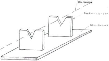 Рассмотрим результаты установки оптического прицела на винтовку. "Идеальный" - планка ластохвоста расположена четко над осью ствола и параллельна ей, кронштейн-моноблок сел креплением идеально на ластохвост и центральная ось колец тоже параллельна оси ствола и наконец - оптическая ось прицела параллельна оси ствола. "Нормальный" - ластохвост расположен под углом к оси ствола, кронштейн-моноблок сел креплением под углом к планке ластохвоста, центральная ось колец регулируется по горизонтали и вертикали и коррекцией доведена до параллельности к оси ствола, как следствие оптическая ось прицела параллельна оси ствола. "Неудачный" - ластохвост расположен под углом к оси ствола, кронштейн-моноблок или кольца сели креплением под углом к планке ластохвоста, центральная ось колец грубо регулируется подкладыванием в кольца тонких прокладок, оптическая ось прицела не параллельна оси ствола, а сетка приводится в ноль серьезными поправками по горизонтали и вертикали. "Идеальный" в природе не встречается, "Неудачный" - это то, что есть у подавляющего большинства стрелков с кронштейнами и кольцами без регулировочных винтов, а переход от "Неудачного" к "Нормальному" случаю, мы и будем рассматривать в этой статье. Процесс регулировок кронштейна зависит от конкретного кронштейна и рассматривается, например на сайте Hans'а в статье по регулируемым кольцам B-Square. В этой статье мы рассмотрим только приведение сетки к оптической оси прицела в домашних условиях. Исторически сложилась практика просто приводить движки (барабаны) поправок прицела в среднее положение путем деления диапазона кликов пополам. Но, на самом деле, нет никаких общих правил, которые бы заставляли производителя помещать сетку точно на оптической оси в середине диапазона поправок прицела. И даже наоборот, прицелы созданные специально для пневматики обычно имеют запас поправок по вертикали, для того, чтобы обеспечить перенос нуля на большие дистанции при крутой траектории полета пули, свойственной пневматическому оружию. Ходят слухи , что на Западе существуют специальные станки промышленного изготовления для точных установок кронштейнов и настройки оптических прицелов на винтовках. Не сомневаюсь, что так оно и есть, хотя бы для упрощения процесса настроек при поточном производстве и продаже винтовок с предустановленными оптическими прицелами. Главный плюс такого станка - это отсутствие фактора человеческого зрения, влияния параллакса и ошибок вращения прицела, как главных причин неточности приведения сетки к оптической оси прицела.Сама задача у меня возникла после приобретения регулируемого кронштейна Sportmatch AOP55, до этого я пользовался кольцами и при смене нуля вносил поправки как по вертикали, так и по горизонтали. Сетка прицела BSA AR 3-12x44, естественно, была смещена для компенсации расхождения осей на нуле 35м, как ниже будет указано расхождение было ~4см на 6м, что значит, что ось прицела была отклонена от оси ствола на 0.382 градуса или 23см на 35м. Итак, приступим к делу. Для начала необходима некоторая материально-техническая подготовка. Необходимо изготовить небольшой станочек (рис. 1). Рис.1 Схема станка (Seva), и что вышло у меня (svar45) за 15 мин. из обрезков вагонки. Его можно сделать, например, из фанеры - "десятки" или из гетинакса или еще из чего нибудь. Состоит станок из основа