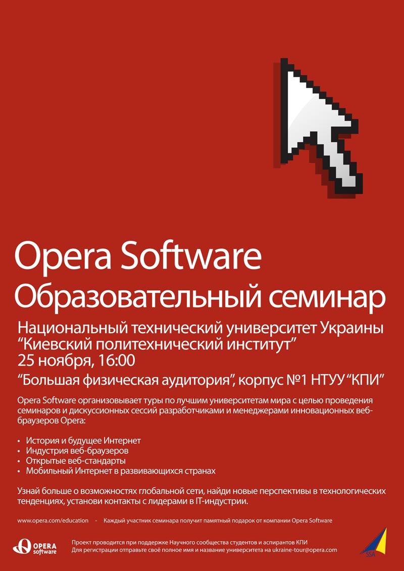 Может кому-то будет интересно. Приглашаем всех желающих на встречу с Opera Software, которая будет проходить 25 ноября 2008 г. в 16:00, место встречи — «Большая физическая аудитория» 1-го корпуса НТУУ «КПИ». Темы семинаров следующие: • Веб-технологии завтрашнего дня • Веб-стандарты как гарант лучшего Интернета • Особенности разработки браузеров нового поколения Вход свободен для всех, но всем желающим лучше зарегистрироваться по адресу ukraine-tour@opera.com