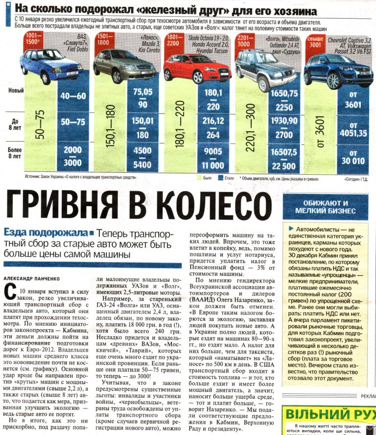 Тем же документом предусмотрено, что с 2009 года вырастет налог с владельцев транспортных средств (транспортный сбор, который платится при техосмотре для владельцев легковушек с мотором свыше 2,2 л и при первой регистрации ввезенных в страну подержанных машин). Если закон вступит в силу после подписания Президентом, владельцам автомобилей с двигателем 2,2 – 6,0 литров придется платить от 1650 до 7200 грн. в год.