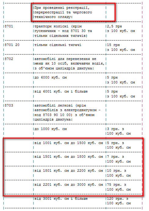 Вместе с тем в законе изменена разбивка по объемам двигателей от 1801 до 3001 и более куб. см. В частности, в действующей редакции закона ставки устанавливались на автомобили с объемом цилиндра двигателя от 1,8 л до 2,5 л в размере 10 грн со 100 куб. см на новые автомобили, 12 грн за 100 куб. см на эксплуатируемые до 8 лет, и 500 грн со 1000 куб.см на авто старше 8 лет, а правительство предлагало повысить их втрое (за исключением эксплуатируемых более 8 лет). На автомобили с двигателями от 2,5 л до 3,5 л ставки сбора составляли соответственно 25 грн, 30 грн и 750 грн, более 3,5 л - 40 грн, 45 грн и 1 тыс. грн за 100 куб. см